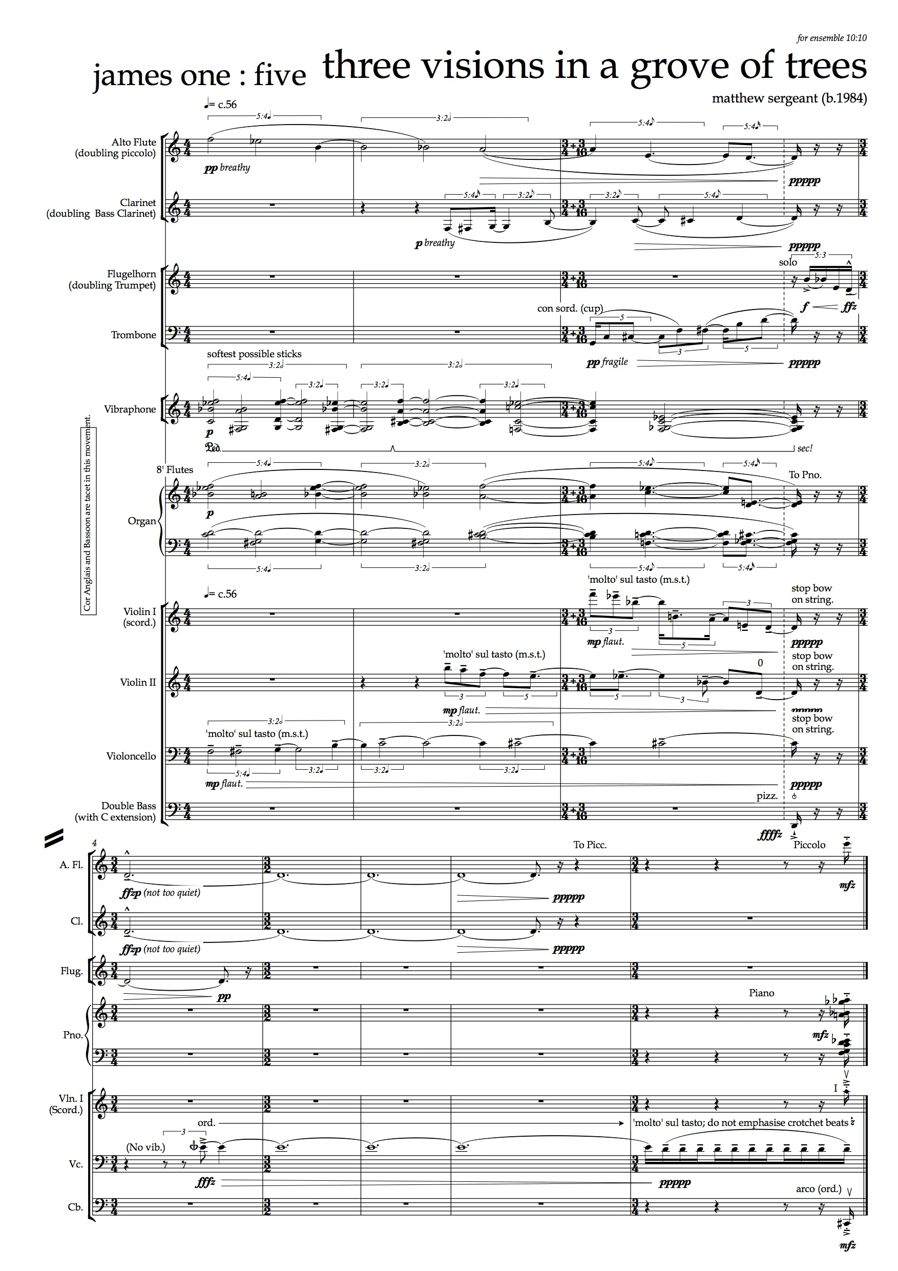 three visions in a grove of trees presents a number of musical ‘visions’, each growing from the music of the previous. In a sense, they are all the same, as if an overheard story is told again in different words. Some are presented within a musical grove of trees, others are not. The work is cast in seven (sometimes short) movements, preceded by a (tenuously related) prelude, subtitled james one : five: